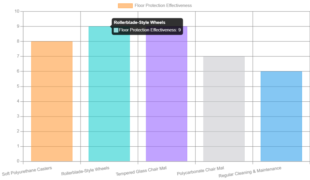The bar chart reinforces that specialized casters are highly effective, with rollerblade-style wheels often providing a slight edge in smooth glide and protection. Tempered glass chair mats offer robust defense, almost on par with the best casters, while polycarbonate mats provide a good balance of protection and cost. Consistent cleaning of both floors and casters is a foundational, though less potent, protective measure.