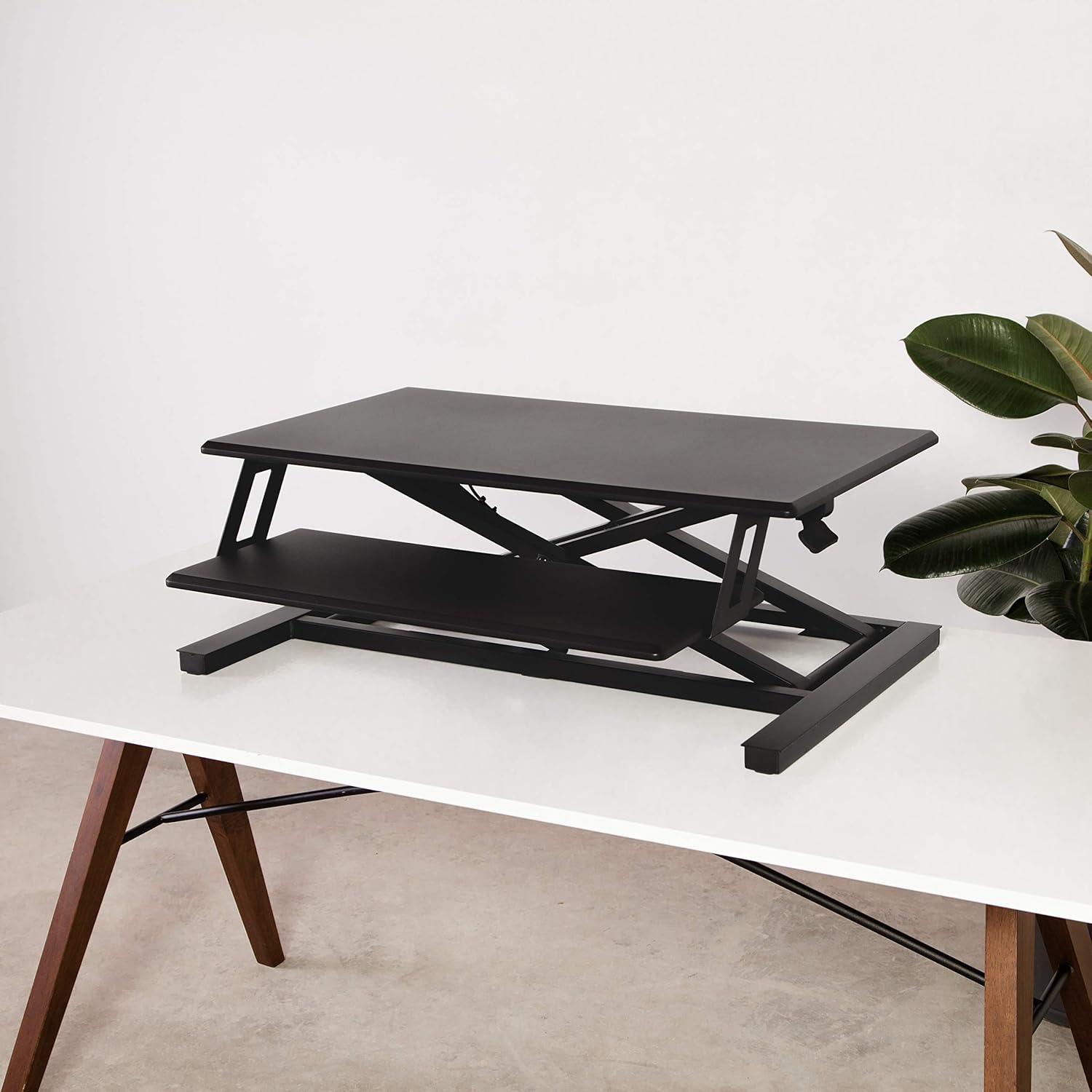 It should allow your knees to be at a 90-degree angle or slightly lower than your hips when seated, matching your standing desk height range.